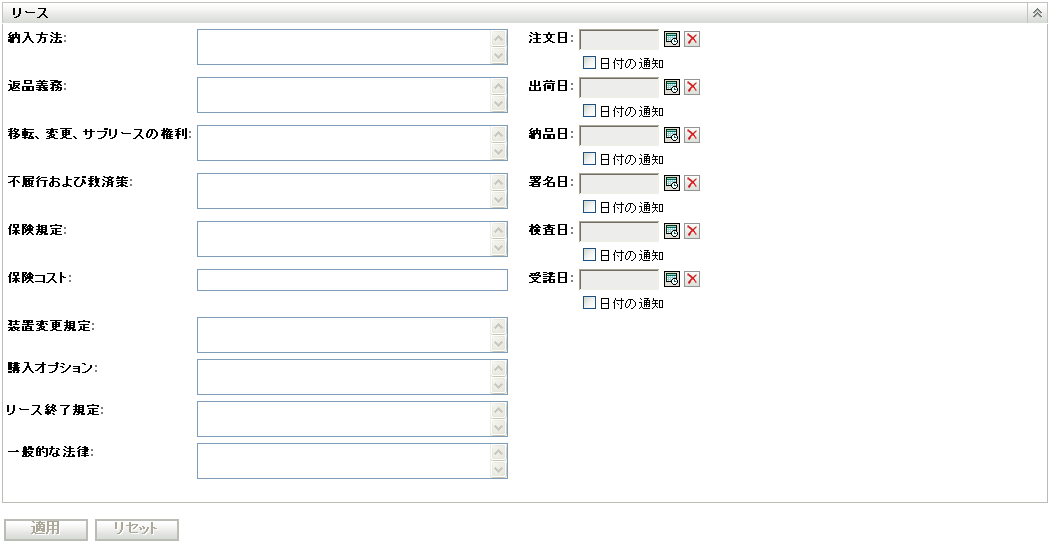 []タブにはリースの詳細が表示され、その詳細を編集できます。複数のフィールドに値を指定します。カレンダアイコンをクリックして、日付を選択します。電子メールで通知を送信するには、[]を選択します。[]をクリックして、変更を保存します。