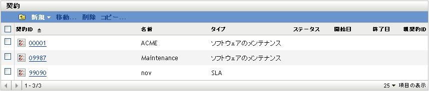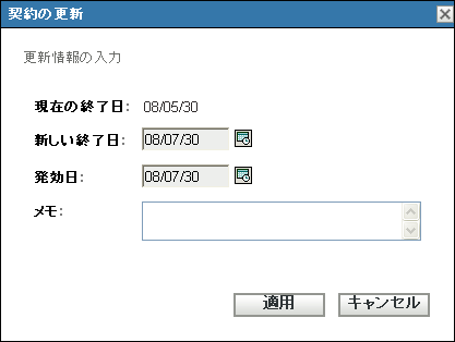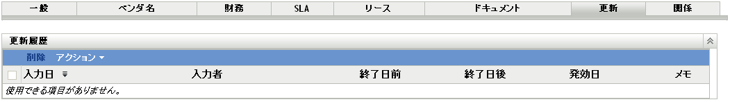 []タブには、契約の更新履歴が表示されます。また、このタブで、更新レコードを追加および削除できます。