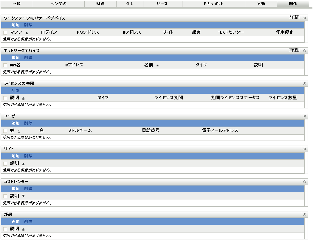 ライセンスエンタイトルメント: ライセンスエンタイトルメントを選択し、[]をクリックして関係を解除します。