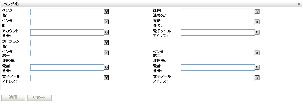 []タブには、ベンダに関する情報が含まれています。これは、新規契約の作成ウィザードで作成した情報です。これらのフィールドは直接編集できます。