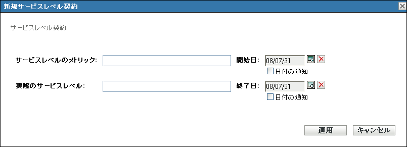 ダイアログボックスで、サービスレベルのメトリックと実際のサービスレベルを指定して、開始日と終了日を選択します。