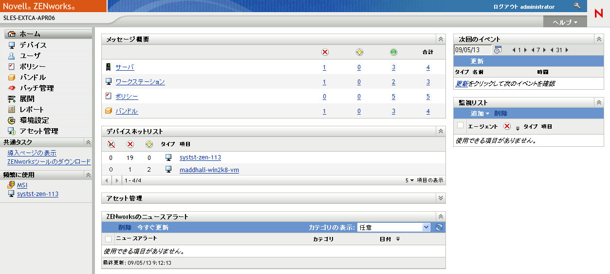 ZENworksシステムは、タスクベースのWebブラウザコンソールであるZENworksコントロールセンター(ZCC)を通じて、管理ゾーンレベルで管理します。 次の図は、WEBブラウザ表示のZCCの部分を示しています。