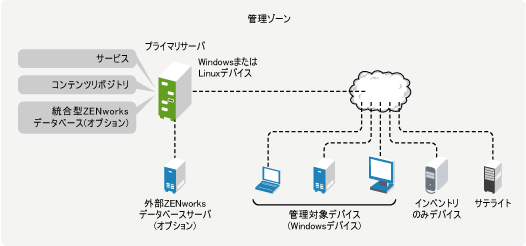 ZENworksシステムアーキテクチャは、主に、プライマリサーバ、サテライト、管理対象デバイス、およびインベントリのみデバイスの4つのコンポーネントから構成されています。これらのコンポーネントは、「管理ゾーン」と呼ばれる管理ドメインで構成されます。