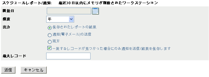 出力: レポートを保存するか、レポートの準備ができたことを知らせる電子メール通知を送信するか、または両方を選択します。結果を保存するか、または一致したレコードが検出されたときにのみ通知を送信するかを選択することもできます。電子メールアドレスの設定の詳細については、セクション 8.2.5, 電子メールアドレスの設定を参照してください。