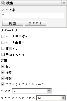 [パッチ]ページの[]セクションには、広範な検索およびデータフィルタリングオプションが用意されており、特定のパッチを検索して、パッチの「ステータス」や「影響」に基づいて結果セットをフィルタすることができます。検索とフィルタリングはそれぞれ独立して実行することもできますが、組み合わせて拡張ドリルダウン機能を実行することもできます。次の図は、[]セクションを示しています。