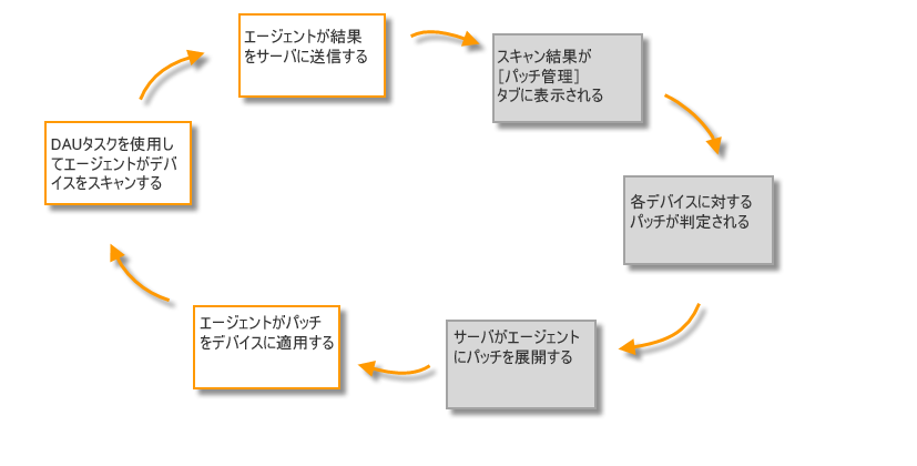 パッチ検出サイクルは、Discover Applicable Update(DAU)タスクがすべてのZENworks管理対象デバイス(サーバとワークステーション)にスケジュールされているZENworksサーバで毎日開始します。