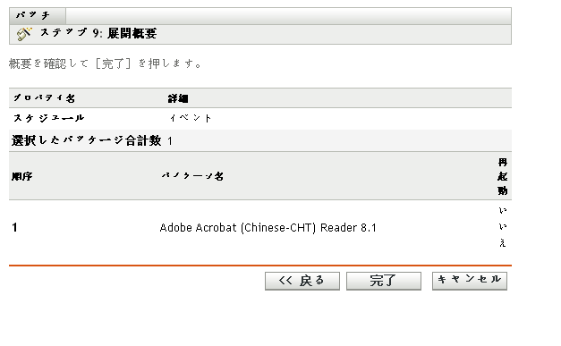 再起動: [展開順序および動作]ページで定義されている、選択されたパッチの再起動設定です。