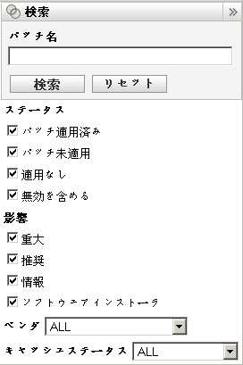 [パッチ]ページの[]セクションには、広範な検索およびデータフィルタリングオプションが用意されており、特定のパッチを検索して、パッチの「ステータス」や「影響」に基づいて結果セットをフィルタすることができます。検索とフィルタリングはそれぞれ独立して実行することもできますが、組み合わせて拡張ドリルダウン機能を実行することもできます。次の図は、[]セクションを示しています。