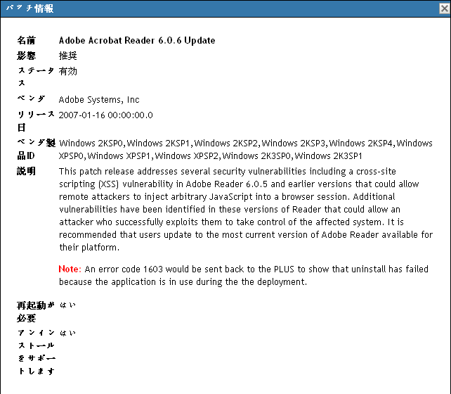 推奨: このパッチは、重大またはセキュリティ関連ではないものの、役立つものであり、コンピュータの良好な状態を保つために適用すべきとNovellによって判断されています。したがって、Novellではこのカテゴリに分類されたパッチを適用することをお勧めします。