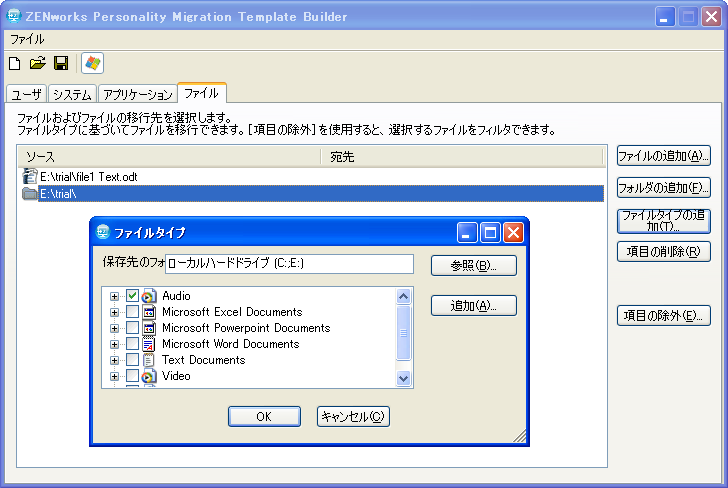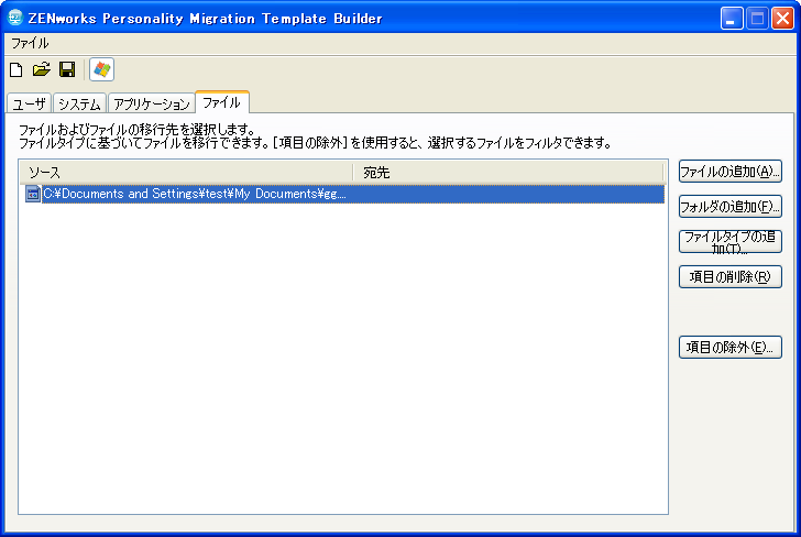 マイグレートするファイルのタイプを追加するには、[]をクリックします。