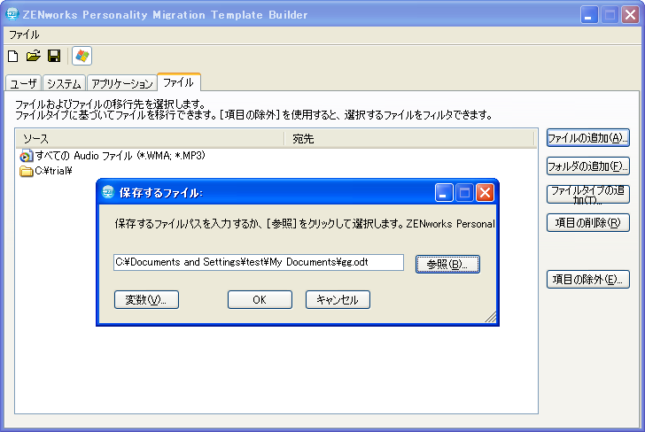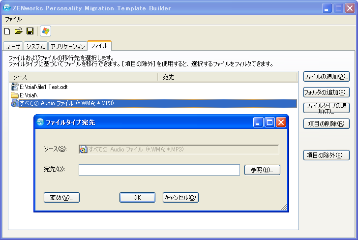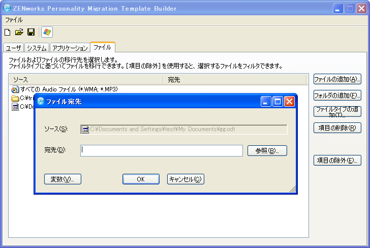 []をクリックし、宛先の場所にマップする変数を選択します。たとえば、file1という名前のファイルをfavoritesディレクトリにマイグレートする場合、[]変数をクリックして「\file1」を追加します。
