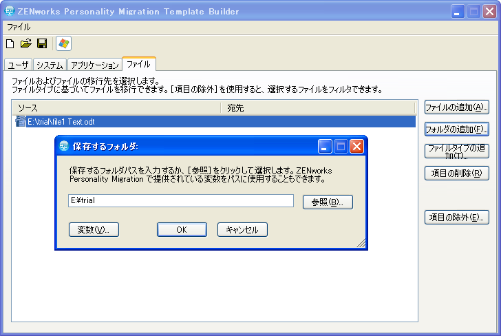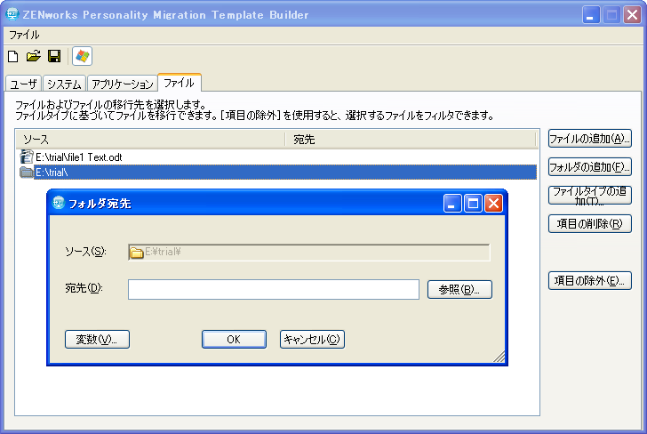[]をクリックし、宛先の場所にマップする変数を選択しますたとえば、folder1という名前のフォルダをprogramfilesディレクトリにマイグレートする場合、[]変数をクリックし、「/folder1」という名前を追加します。