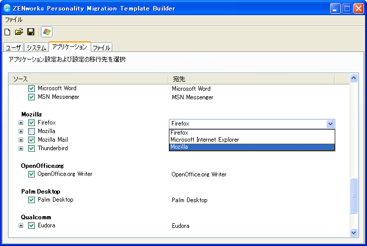 []カラムのドロップダウンリストから、適切な宛先のアプリケーションを選択します。ZENworks Personality Migrationでは、次のようなアプリケーション間での設定のマイグレーションがサポートされています。