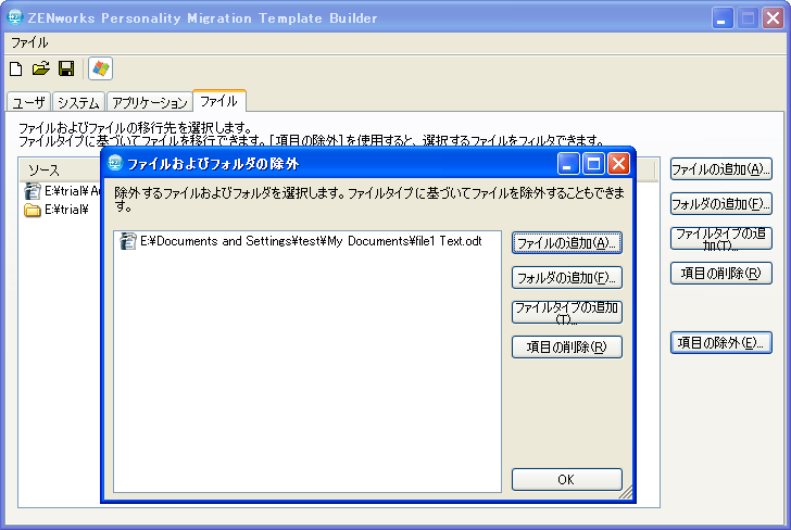 ファイルの追加: []をクリックし、マイグレーションから除外するファイルを選択します。