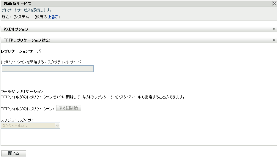 tftpディレクトリの変更をサーバに複製する際のスケジュールを設定します。スケジュールの設定のほか、レプリケーションを即座に開始することもできます。