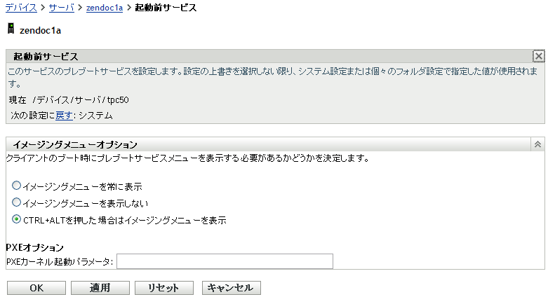 使用する設定を表示するNovellプレブートサービスメニュー、およびメニューをブート時にデバイスに表示するかどうかを決定できます。デフォルトでは、管理ゾーンは、すべてのフォルダおよびデバイスに適用されます。これは、フォルダまたはデバイスレベルで上書きできます。