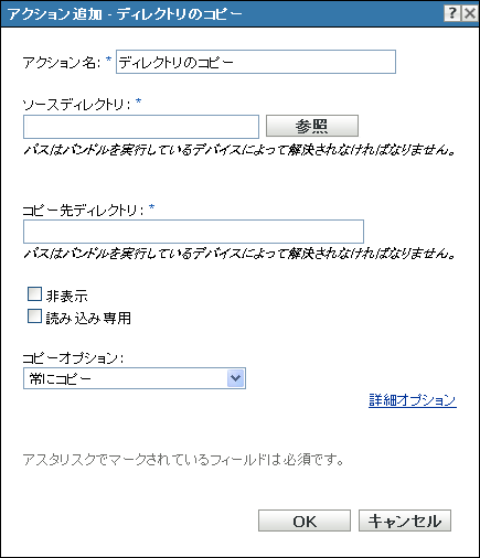 [アクション - ディレクトリのコピー]ダイアログボックスでは、コピーするディレクトリ、およびその宛先ディレクトリを指定できます。また、実行プログラムのセキュリティレベルも指定できます。