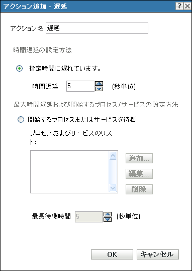アクションセット内の次のアクションを実行する前に、開始するプロセスまたはサービスの最大待ち時間を指定します。プロセスまたはサービスが指定済み時間内に開始されない場合は、次のアクションが実行されます。