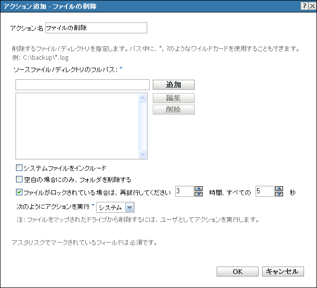 ソースファイル/ディレクトリのフルパス: 削除するファイルまたはディレクトリのフルパスを指定し、[]をクリックして、ファイルまたはディレクトリをリストに追加します。ワイルドカード文字を使用できます。マップされたネットワークドライブを使用してパスを指定する場合、[]リストから[]を選択する必要があります。