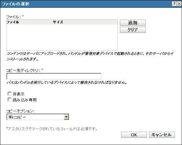 [アクション - ファイルのインストール]ダイアログボックスでは、コンテンツサーバとデバイス間でコピーするファイル、宛先ディレクトリとファイル名、およびコピーオプションを指定できます。