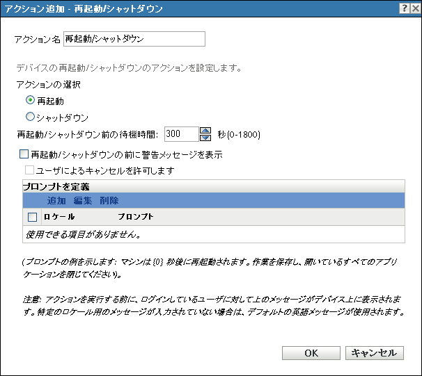 [アクション - 再起動/シャットダウン]ダイアログボックスでは、デバイスの再起動またはシャットダウンアクションを指定できます。