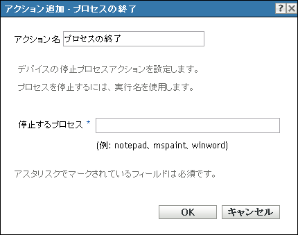 [アクション - プロセスの終了]ダイアログボックスでは、停止するプロセスの実行プログラムの名前を指定できます(たとえば、notepad、mspaint、winwordなどです)。プロセスがデバイス上で実行されない場合は、[プロセスの終了]タスクが完了します。
