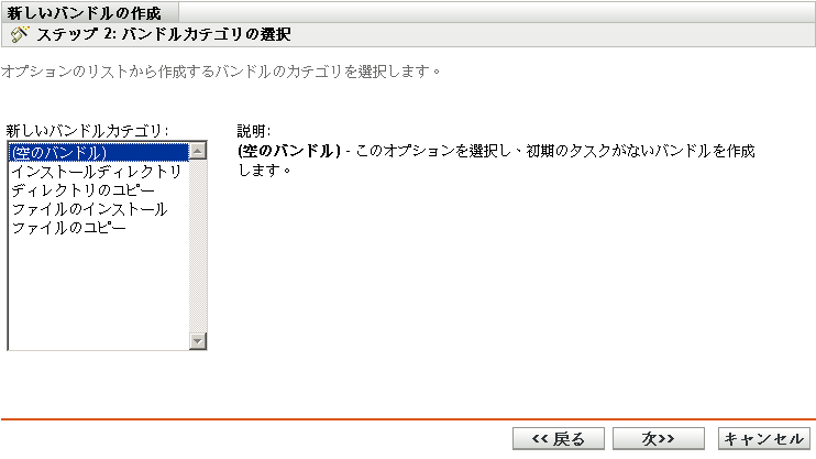 空のバンドル: 初期のタスクがないバンドルです。このバンドルカテゴリは、新しいバンドルの作成ウィザードですべてのタスクを実行することなく、すばやくバンドルを作成するために便利です。空のバンドルを作成すると、詳細を編集して、割り当て、アクションなどを後から追加することができます。