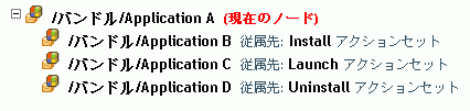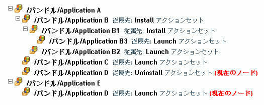 バンドルの[従属バンドル]ツリーには、バンドルのチェーン情報、および各従属が存在するアクションセットが表示されます。ZENworksコントロールセンターに[従属バンドル]ツリーを表示するには、[]タブをクリックし、従属バンドルを持つバンドルを1つクリックしてから、[]タブの[]リンク([]行)をクリックします。バンドル従属関係を持たないバンドルを選択した場合は、[]が[]に代わって表示されます。