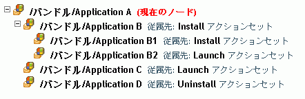 前の例で、アプリケーションBはアプリケーションAの依存バンドルの1つです。同時に、アプリケーションBはアプリケーションB1およびアプリケーションB2という2つのバンドルに対する従属も持っています。