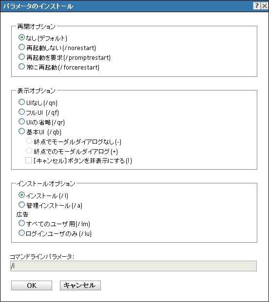 アプリケーションのインストール中に使用するインストールコマンドラインパラメータが表示されます。[再起動]、[表示]、および[インストール]のオプションを選択すると、このフィールド内のコマンドラインパラメータは自動的に入力されます。