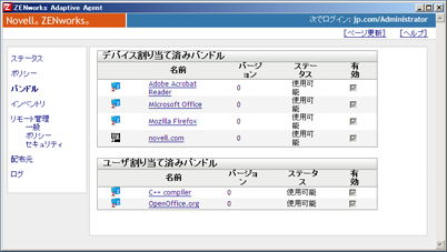 は、Windows通知領域にあります。アイコンをダブルクリックすると、ZENworks Adaptive Agentのプロパティを表示できます。左のナビゲーションペインにある[バンドル]リンクをクリックすると、ユーザおよびご使用のデバイスに割り当てられたバンドルを表示できます。