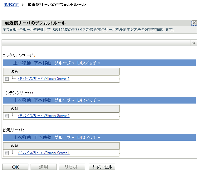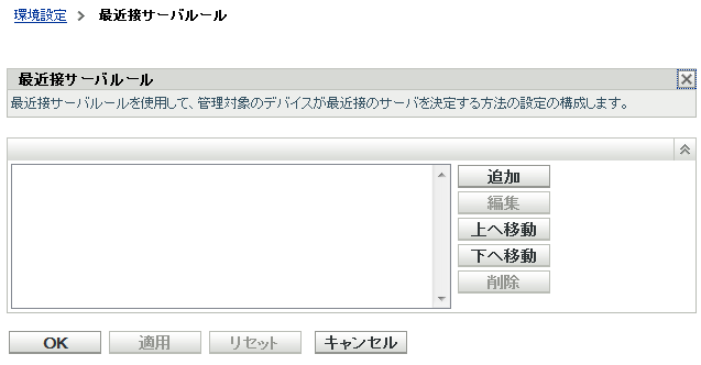 最近接サーバのルールが定義されていないか、または適用されていない場合、最近接サーバのデフォルトルールを使用すると、最近接のコレクション、コンテンツ、および設定サーバを判断するためにデバイスによって使用されるルールを定義できます。このルールは、デバイスにコンタクトさせたい順番にサーバを並べただけのリストです。リストにサーバを追加したり、リストからサーバを削除したりすることはできません。