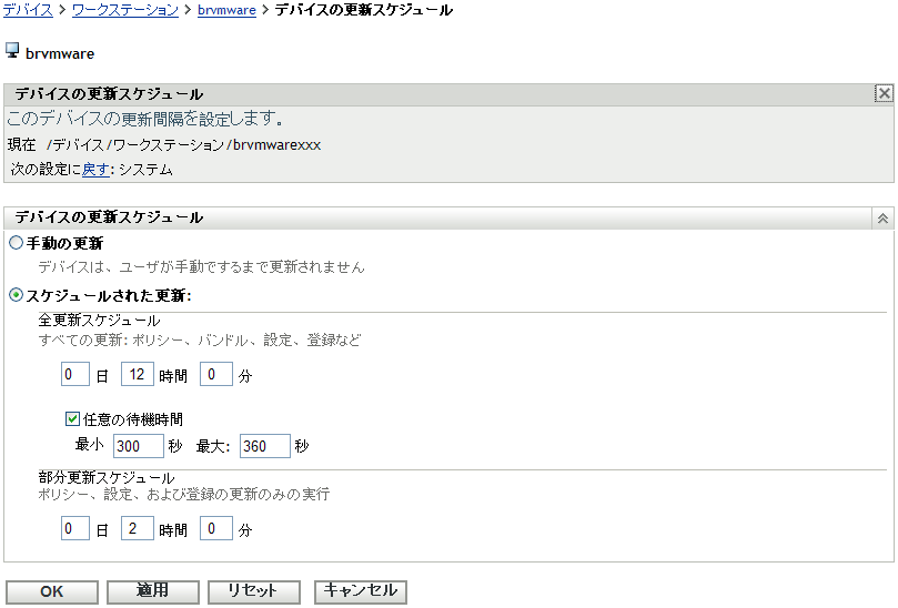 デバイス更新スケジュールを使用して、デバイスがZENworksサーバにコンタクトしてバンドル、ポリシー、設定、および登録情報を更新する頻度を決定できます。スケジュールは次のレベルで定義できます。