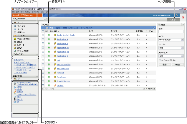 作業パネル: 作業パネルでは、ZENworksシステムの管理および監視を行います。パネルは、現在のページによって異なります。上の例では、[デバイス]と[検索]という2つの作業パネルがあります。[デバイス]パネルには、作成されたサーバ、フォルダ、サーバグループ、およびダイナミックサーバグループのリストが表示され、このパネルを使用してサーバを管理できます。[検索]パネルでは、デバイスの名前、オペレーティングシステム、ステータスなどの条件で、[デバイス]パネルをフィルタできます。