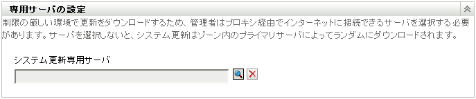 デフォルトでは、管理ゾーン内の使用可能なすべてのプライマリサーバは、ランダムに更新をダウンロードするために使用できます。ただし、更新のダウンロードを専用で処理するために、1つのZENworksサーバを指定できます。選択したサーバは、直接またはプロキシサーバを経由して、インターネットにアクセスできる必要があります。