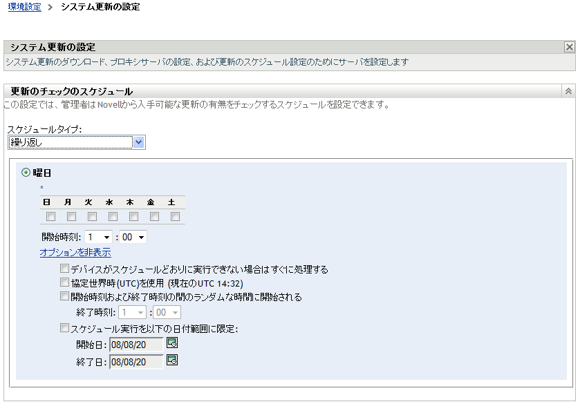繰り返し: 更新を確認する頻度を指定できます。このオプションを設定すると、スケジュールが実行されるときに、Novellから[]タブの[使用可能なシステム更新]パネルに、入手可能な更新の情報が自動的にダウンロードされます。これによって、更新のコンテンツ自体が自動的にダウンロードされるわけではありません。反復スケジュールを設定するには、ステップ 4に進んでください。