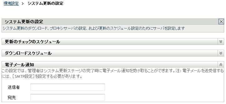 送信者: 管理者の電子メールアドレスを指定するか、説明的なテキスト(たとえば、 System-Update-Stage-Noticeなど)入力します。単語と単語の間にはスペース文字を使用しないでください。