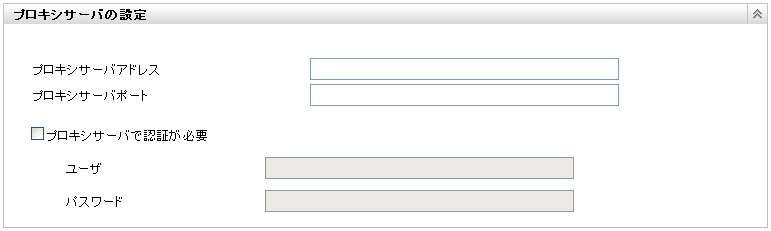 プロキシサーバには認証が必要: このチェックボックスをオンにすると、[]および[]フィールドが編集可能になります。認証が必要な場合、このチェックボックスをオンにし、プロキシサーバにアクセスするためのユーザ名およびパスワードを指定します。