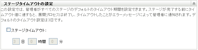 []タブで、(必要に応じて)[]パネルを展開し、[]をクリックします。次に、[]をクリックし、[ステージタイムアウトの設定]パネルを表示します。