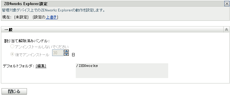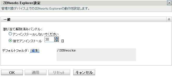 ZENworks Explorerの[全般]パネルでは、デバイスに割り当てられていないバンドルをアンインストールするようZENworks Explorerを設定したり、バンドルをアンインストールするまで待機する日数を指定したり、ZENworks Explorerが使用するデフォルトのフォルダを指定したりすることができます。