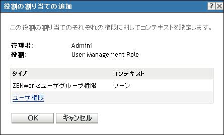 [役割の割り当ての追加]ダイアログボックスが表示され、役割に含まれた役割タイプのコンテキストを定義できます。コンテキストを使用すると、与えられた権限を使用できる場所を制限することができます。たとえば、管理者のクイックタスク権限の役割をZENworksコントロールセンターの[デバイス]フォルダに限定するよう指定できます。