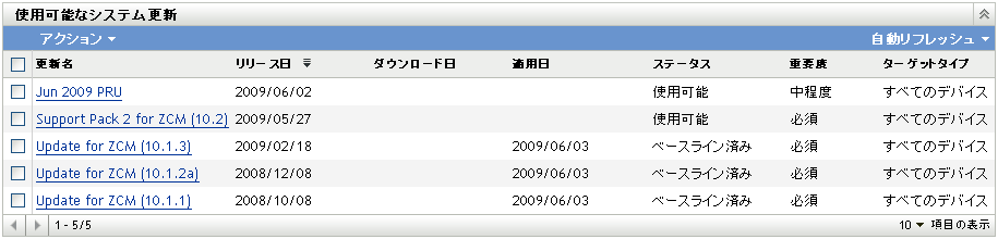 ZENworksコントロールセンターの左側のペインで[]をクリックし、[]タブをクリックし、[使用可能なシステム更新]パネルを表示します。
