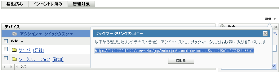 ブックマーク機能によって、通常のナビゲーションのようにクリックしなくても、Webブラウザを使用してZENworksコントロールセンター()のさまざまな場所に直接アクセスできます。この機能を使用すると、見つけにくい場所もブックマークできます。