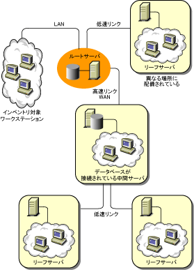 この構成では、インベントリサーバが低速WANリンクで中間サーバに接続されています。中間サーバにもインベントリデータベースが搭載されており、この中間サーバは情報をルートサーバに転送します。ルートサーバには、他のインベントリサーバも接続されます。