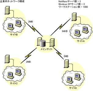 次の図は、サーバが複数の場所に分散している企業内ネットワークの編成を示しています。
