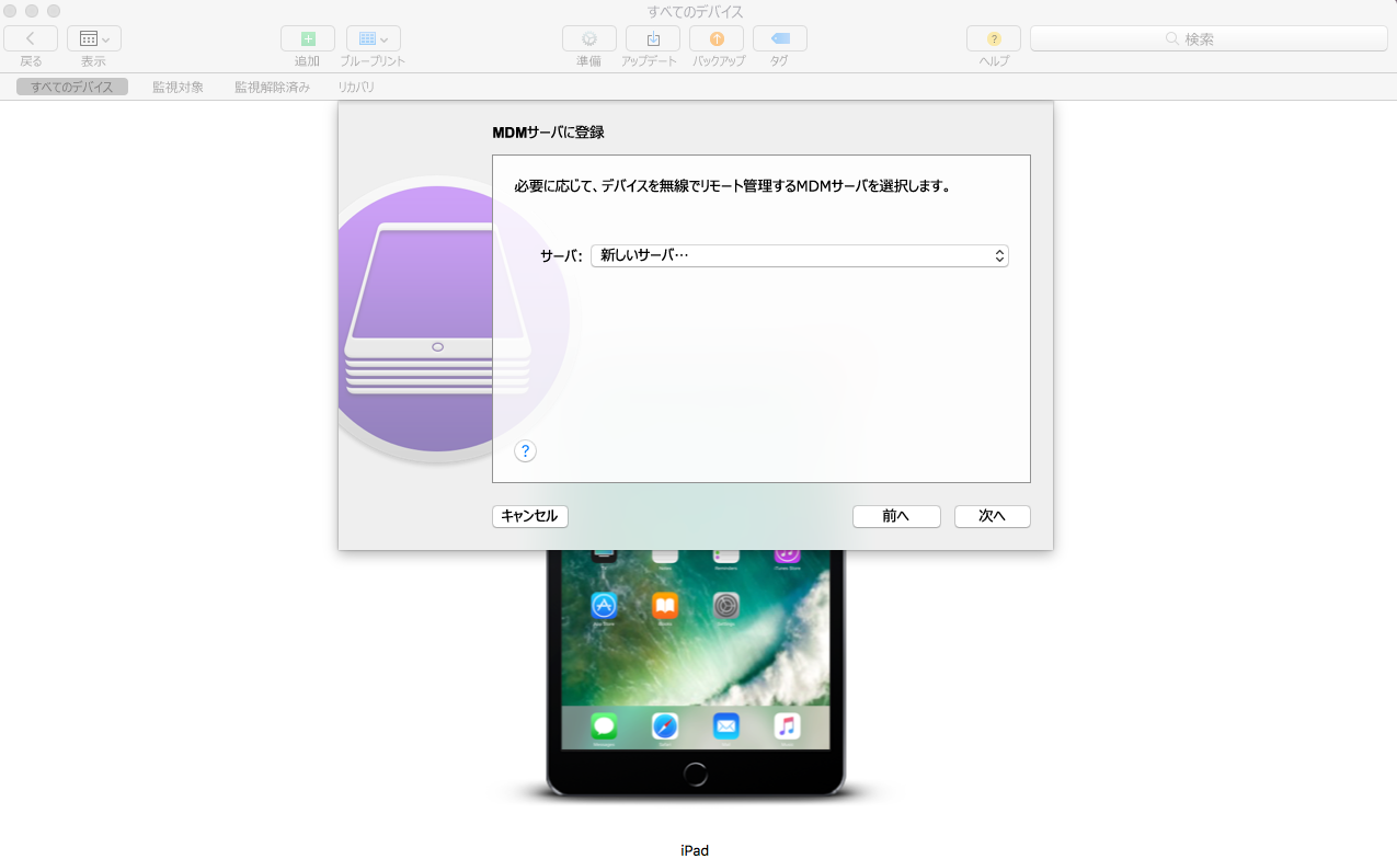 デバイスの登録先となるMDMサーバを選択します。ドロップダウンメニューに保存されたMDMサーバがない場合は、New Server (新しいサーバ)を選択します。