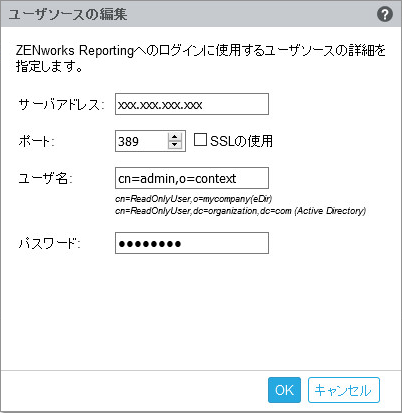 ユーザ名: ZENworks Reportingサーバは、認証されるにはログインを試みるたびにLDAPディレクトリに対する読み込み専用アクセス権が必要です。読み込み専用アクセス権の取得にこのユーザの資格情報が使用されます。