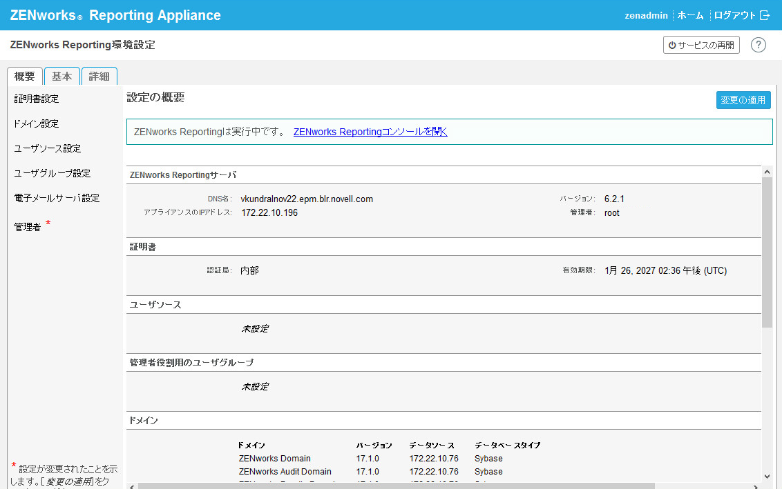 ZENworks Reporting サーバコンソール(https://<ip>:8443) に管理者としてログインします。
