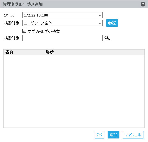 検索対象: 検索するグループの名前または名前を含む数文字を指定し、検索アイコンをクリックします。検索テキストを含むグループ名が検索コンテナに表示されます。検索結果から1つ以上のグループを選択できます。OKをクリックしてユーザグループを追加します。または、これらを設定する場合には追加をクリックして続行します。