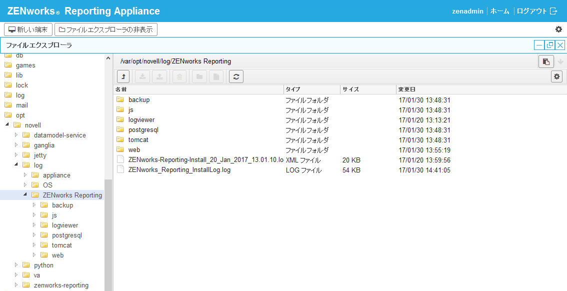 ZENworks Reportingアプライアンスで監視されるすべてのログファイルが仮想ツリー構造で整理され、特定のファイルまたはフォルダのパスが表示されます。監視モードまたは最初から表示モードで、ログファイルを表示できます。
